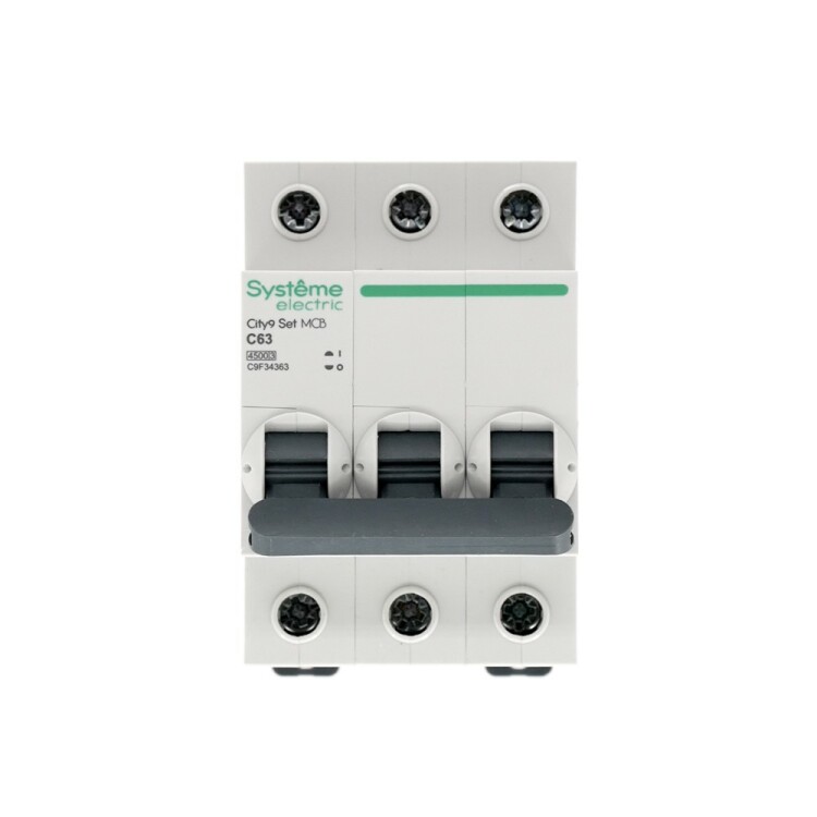 Автоматический выключатель серии City9 Set Systeme Electric, 3-полюсный, номинальный ток 63 А, характеристика С, Icn = 4.5 кА. Применяется в электрических сетях напряжением 400 В. Предназначен для защиты от перегрузок и токов короткого замыкания. Оснащен механизмом «мгновенной коммутации». Ударопрочный корпус из специального пластика с 6 металлическими заклепками. Безопасные клеммы исключают попадание кабелей в заклеммное пространство (ранее Schneider Electric EZ9F34363).