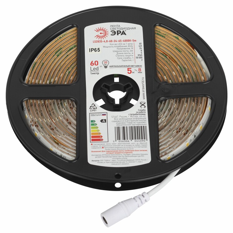 Светодиодная лента ЭРА LS2835 -4,8-60-12-4000K-IP65-1 year-5m дневной белый 5м со степенью защиты от пыли и влаги IP65 - современный способ создания внутреннего освещения, подсветки ниш, лестничного пространства, систем хранения, а также декоративного и художественного оформления любых объектов и форм в помещениях с повышенным уровнем влажности и уличного освещения. Легко и быстро устанавливается на любой гладкой поверхности с помощью скотча, расположенного на оборотной стороне ленты. Используя алюминиевый профиль, можно создавать необычные и функциональные решения освещения в Вашем интерьере. Рабочее напряжение ленты составляет 12В, а мощность равна 4,8 Вт/м. Светодиодная лента обладает световым потоком 400 Лм/м, и цветом свечения - дневной белый (4000 К)