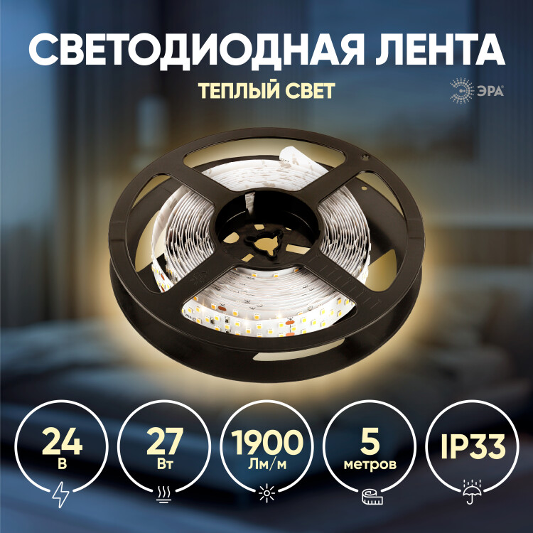 ЭРА Лента светодиодная LS2835-27-252-24-33-3000К-triple-5m (40/320) со степенью защиты от пыли и влаги IP20 - современный способ создания внутреннего освещения, подсветки ниш, лестничного пространства, систем хранения, а также декоративного и художественного оформления любых объектов и форм в помещениях. Легко и быстро устанавливается на любой гладкой поверхности с помощью скотча, расположенного на оборотной стороне ленты Используя алюминиевый профиль, можно создавать необычные и функциональные решения освещения в Вашем интерьере. Рабочее напряжение ленты составляет 24В, а мощность равна 27Вт/м. Светодиодная лента обладает световым потоком 1900 Лм/м, и цветом свечения - теплый белый (3000 К)