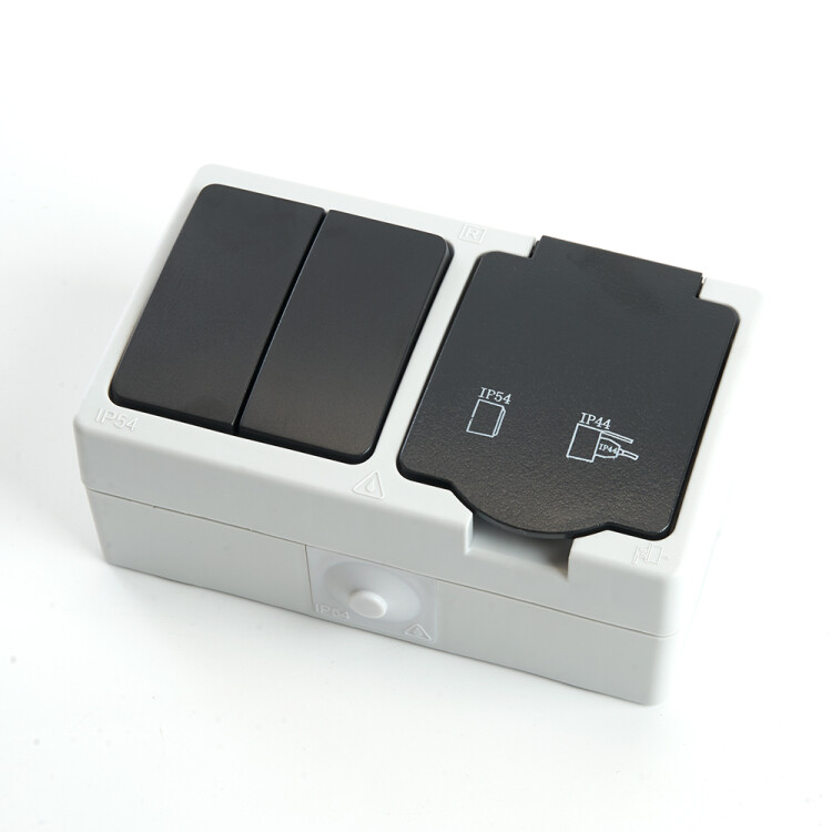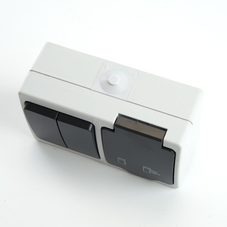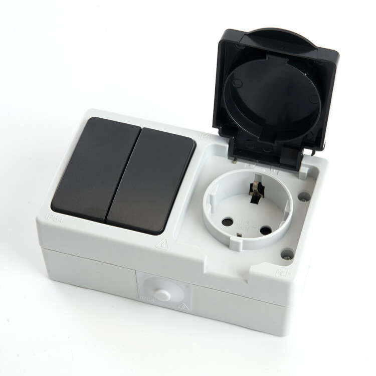 Розетка STEKKER PST16-11-54/10-121-54 (блок с выключателем двухклав., однополюсным для двух цепей с общим вводом, расстояние между монтажн. отвер-ми: по гориз. - 113мм, по вертик.- 65мм) на 1 гнездо, с крышкой, с заземлением. Материал: Полипропилен, ABS пластик, цвет серый-графит, размер 130*80*55мм. Номинальное напряжение 250, номинальный ток 16А, диапазон рабочих температур 0..+35°C, IP54