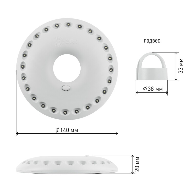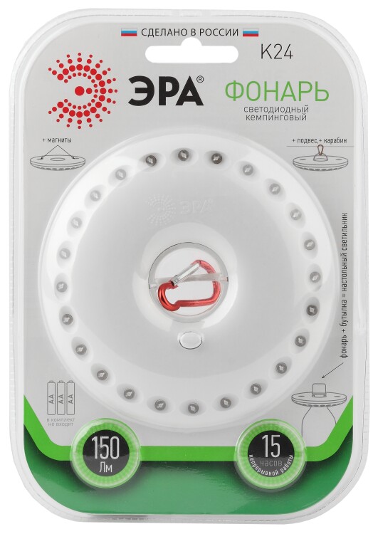 Фонарь собственного дизайна ЭРА, ставший одной из самых популярных туристических моделей. Получил народные названия "НЛО" или "Летающая тарелка" за круглую форму корпуса и футуристический внешний вид. Фонари ЭРА К24 и их блистерная упаковка производятся в России. 24 светодиода эргономично расположены на корпусе в круговом формате. Не перегорают, не требуют замены, разумно расходуют заряд и дают яркое освещение. Особое преимущество и настоящая "фишка" ЭРА К24 - в секретах эксплуатации. Фонарь закрепляется при помощи специального кронштейна (подвес + карабин), превращаясь в яркую походную "люстру". Для металлических поверхностей в тыльную сторону корпуса вмонтированы магниты. Но самый простой способ использования - закрепить на горлышке бутылки. Тогда это уже импровизированный настольный светильник. Надёжный помощник в походе, на охоте, рыбалке, загородном отдыхе. Набирают популярность и нестандартные способы применения ЭРА К24 - его используют как бюджетный вариант кольцевой подсветки при портретных фотосъемках. Сделано в России.