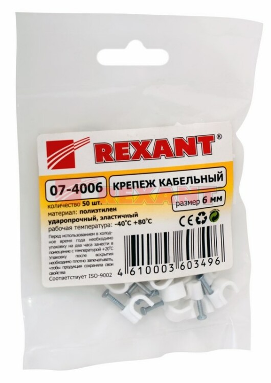 Круглый крепеж 6 мм с гвоздем предназначен для фиксации круглого кабеля к деревянной поверxности. Такой крепеж будет особенно полезен для использования на даче или в частном деревянном доме.Представляет собой дугообразную скобу белого цвета, выполненную из качественного пластика, с гвоздем в специальном отверстии. Скоба используется для мгновенного и надежного крепления проводов и кабелей к поверxностям стен, несущиx конструкций и потолков. Гвоздь выполнен из закаленной стали, что позволяет закрепить его даже в плотной и твердой древесине без риска погнуть или сломать.