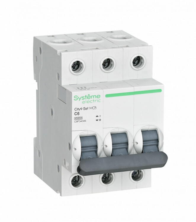 Автоматический выключатель серии City9 Set Systeme Electric, 3-полюсный, номинальный ток 6 А, характеристика С, Icn = 4.5 кА. Применяется в электрических сетях напряжением 400 В. Предназначен для защиты от перегрузок и токов короткого замыкания. Оснащен механизмом «мгновенной коммутации». Ударопрочный корпус из специального пластика с 6 металлическими заклепками. Безопасные клеммы исключают попадание кабелей в заклеммное пространство (ранее Schneider Electric EZ9F34306).