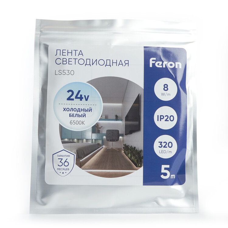 Лента светодиодная 24V FERON LS530, 320*COB, 8W/m, IP20, 6500К (холодный белый), Кратность резки мм 50мм, 5000*8*1,80мм