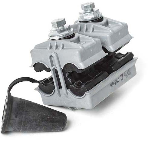 Герметичный ответвительный зажим RP 240 предназначен для соединения ВЛЗ магистрали с проводами ответвлений в воздушных сетях напряжением 6-20 кВ. Надежный электрический контакт обеспечивается методом прокалывания изоляции жил проводов магистрали и ответвления. При затягивании болта его острые элементы прокалывают изоляцию, создавая соединение. При достижении необходимого усилия затяжки головка болта срывается, предотвращая перетяжку и повреждение провода. Срывная головка металлическая. Не требует использования специализированного инструмента. Контактные пластины изготовлены из алюминиевого сплава, обеспечивают хорошую проводимость и совместимость с алюминиевыми проводами. Прокалывающие зубья контактных пластин зажимов имеют пирамидальную форму, благодаря этому достигается быстрый электрический контакт и надежная герметизация зажимов. Прокалывающие элементы покрыты токопроводящей смазкой для снижения переходного сопротивления и защиты от окисления. Зажим устойчив к ультрафиолету, перепадам температур (от -60°С до +50°С), коррозии и агрессивным атмосферным воздействиям.
