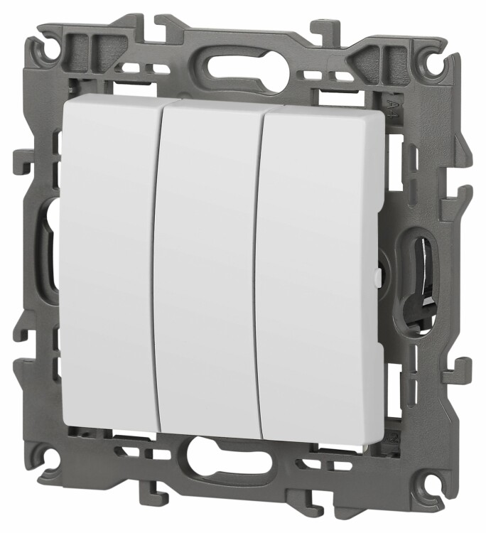 Выключатель 3-клавишный Эра Elegance белый 14-1107-01. Рамки приобретаются отдельно. Рамки Эра Elegance ПЛАСТИК: 1 пост 14-5001-хх, 2 поста 14-5002-хх, 3 поста 14-5003-хх, 4 поста 14-5004-хх, 5 постов 14-5005-хх; СТЕКЛО: 1 пост 14-5101-хх, 2 поста 14-5102-хх, 3 поста 14-5103-хх, 4 поста 14-5104-хх; МЕТАЛЛ: 1 пост 14-5201-хх, 2 поста 14-5202-хх, 3 поста 14-5203-хх, 4 поста 14-5204-хх; ДЕРЕВО: 1 пост 14-5301-хх, 2 поста 14-5302-хх, 3 поста 14-5303-хх, 4 поста 14-5304-хх (хх - код цвета: 00-прозрачный, 01-белый, белёный дуб, 02-слоновая кость, 03-алюминий, 04-шампань, 05-чёрный, чёрное дерево, 07-ясень, 09-дуб, 10-венге, 11-клён, 14-медь, 21-жёлтый, 22-оранжевый, 23-красный, 25-бордо, 26-лайм, 27-зелёный, 28-голубой, 29-синий, 30-розовый, 31-мокко, 32-серый, 41-сталь, 42-титан).