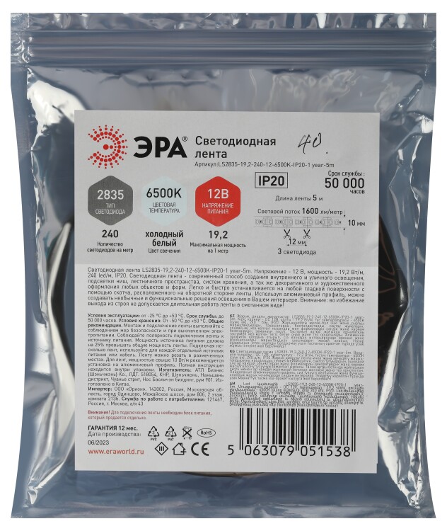 Светодиодная лента ЭРА LS2835 -19,2-240-12-6500K-IP20-1 year-5m холодный белый 5м со степенью защиты от пыли и влаги IP20 - современный способ создания внутреннего освещения, подсветки ниш, лестничного пространства, систем хранения, а также декоративного и художественного оформления любых объектов и форм в помещениях. Легко и быстро устанавливается на любой гладкой поверхности с помощью скотча, расположенного на оборотной стороне ленты. Используя алюминиевый профиль, можно создавать необычные и функциональные решения освещения в Вашем интерьере. Рабочее напряжение ленты составляет 12В, а мощность равна 19,2 Вт/м. Светодиодная лента обладает световым потоком 1600 Лм/м, и цветом свечения - холодный белый (6500 K)
