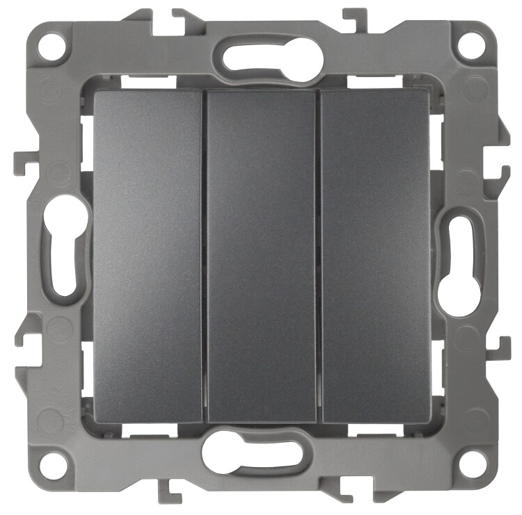 Выключатель 3-клавишный серии Эра 12 скрытой установки механизм цвет графит 12-1107-12. Номинальные характеристики 10А 250В . Сделан из поликарбоната, оснащён винтовыми уникальными клеммами ЭКСПЕРТ для надёжной фиксации жил кабеля в механиме. Парные клеммы обеспечивают соединение шлейфом. Монтаж в подрозетник производится и на лапки, и на винты. Рамки приобретаются отдельно.