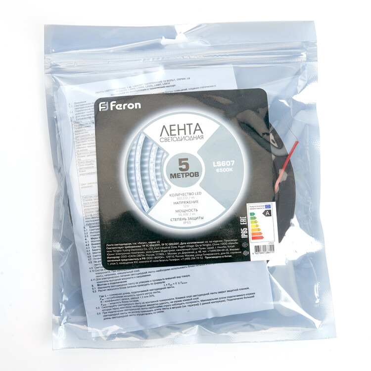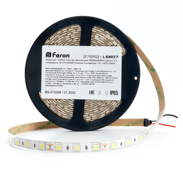 Лента светодиодная 12V FERON LS607, 60*SMD5050, 14,4W/m, IP65, 6500К (холодный белый), Кратность резки мм 50мм, 5000 *10 *3мм