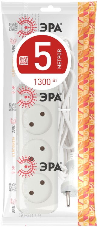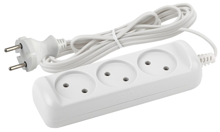 Бытовой удлинитель ЭРА UX-3-5m на 3 гнезда, отличается длинным проводом 5 метров ШВВП 2x0,75мм2. Рассчитан для подключения простых бытовых приборов стандартной мощности. Максимальная нагрузка - 6 A/ 1300 Вт. Базовый белый цвет, аккуратный дизайн с закруглёнными углами. Для комфорта и безопасности гнёзда слегка "утоплены" в корпус. Изготовлен из надёжного полипропилена со специальными антипиренами, препятствующими горению.
