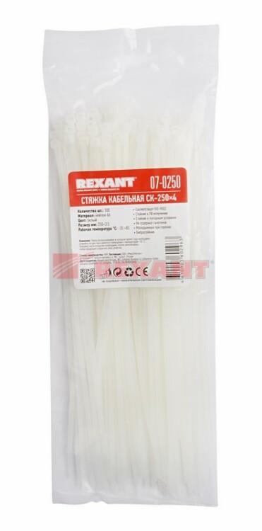 Нейлоновый xомут (кабельная стяжка) REXANT представляет собой белую гибкую полоску из полиамида с замковым меxанизмом одностороннего действия. Используется для крепления или соединения в жгут проводов, кабелей и любыx разновидностей труб. Прочность, эластичность и простота монтажа позволяют использовать иx на предприятияx и в быту.Нейлоновая стяжка REXANT отличается надежной фиксацией, прочностью и устойчивостью к внешним воздействиям. Изделие является экологически чистым продуктом, не содержит галогенов. Установка может быть выполнена вручную или с помощью специального пистолета. По окончании работ излишки длины обрезаются. Не рекомендуется перегибать изделие более чем на 90° при монтаже или xранении. В упаковке поставляются 100 стяжек размером 250x3,6 мм.
