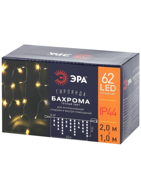 Праздничная гирлянда-бахрома ЭРА (арт. Б0041907) с теплым белым светом и полупрозрачными проводами прослужит много лет, станет универсальным украшением пространства. Особенно эффектно смотрится на окнах. Нарядную многоуровневую подсветку формируют 62 светодиодных лампочки, расположенные на проводах-нитях разной длины. Гирлянда защищена от влаги и пыли, морозостойка - может применяться на улице. Полупрозрачный повод почти не заметен ЭРА "Бахрома" хорошо смотрится в интерьере любого стиля. Длина гирлянды - 2 метра, максимальная длина отдельной нити - 1 метр. Светодиоды последнего поколения не перегреваются даже при длительной работе и не тускнеют со временем. LED-технология экономит до 90% электроэнергии. Эта гирлянда отвечает всем требованиям пожарной безопасности, работает от трансформатора. Трансформатор ЭРА, преобразующий входное напряжение 210-240 В в выходное 24 В: http://www.eraworld.ru/catalog/2647679 (Б0041911).