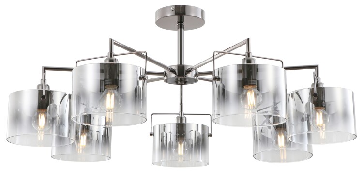 В коллекции Rivoli Bonnie представлены люстры под 5 и 7 ламп (арт. 2078-305 и 2078-307). Люстры и бра (арт. 2078-401) Bonnie применяются с лампами Е14 40 Вт. Данная люстра потолочная на штанге имеет 7 стеклянных плафонов в форме абажуров. В сочетании с «телескопическими» рожками подчёркнутой геометрии это делает люстры потолочные Bonnie прекрасным решением для современных интерьеров – стиль и уют. Арматура люстры имеет стойкое гальваническое покрытие редкого цвета чёрный жемчуг. С этим оттенком гармонично сочетается дымчатое тонирование стекла люстры на потолок. Высота люстры со штангой – 310 мм. Короткая штанга позволяет успешно использовать эти люстры в стандартных жилых комнатах с невысокими потолками или потолками средней высоты. При этом большое количество источников света обеспечит вас ярким качественным освещением.