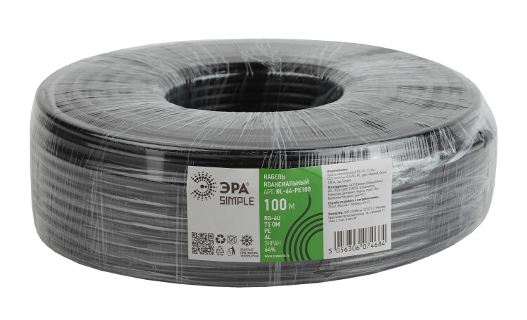 ЭРА Кабель коаксиальный RG-6U, 75 Ом, CCS/(оплётка Al 64%), PE, цвет чёрный, бухта 100 м, SIMPLE (6/144)