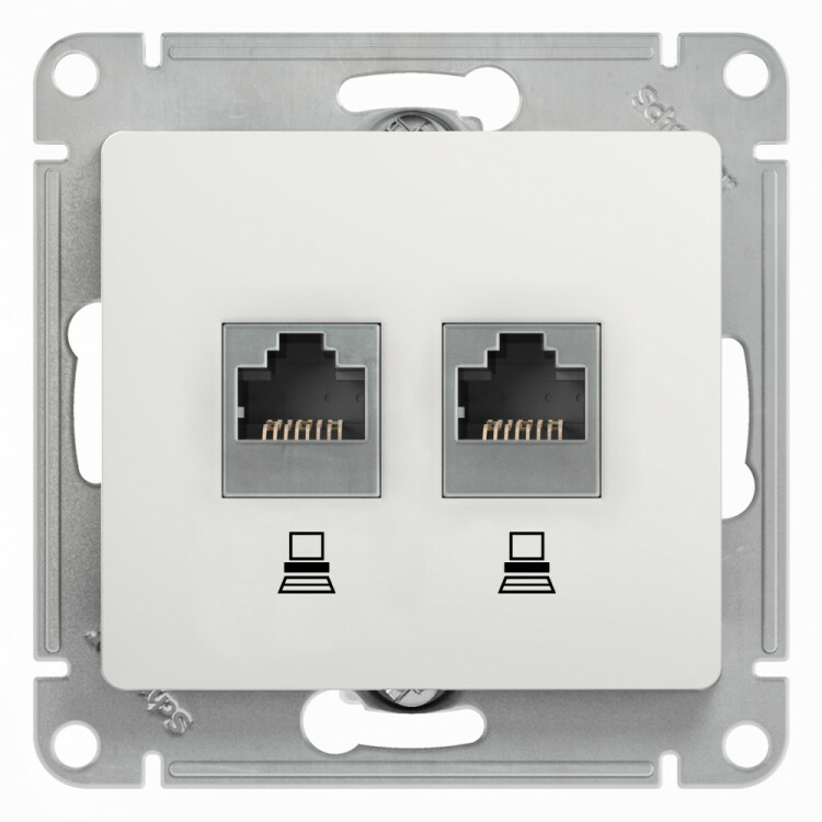 Механизм Systeme Electric (ранее Schneider Electric) серии Glossa (цвет белый) двойной розетки компьютерной с разъёмом RJ45 категория 5е предназначен для удобного и быстрого подключения вашего компьютера к компьютерной сети. Выполнен из материала PС+ASA, стойкого к УФ-излучению и появлению царапин.