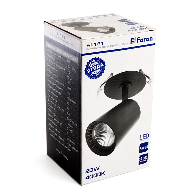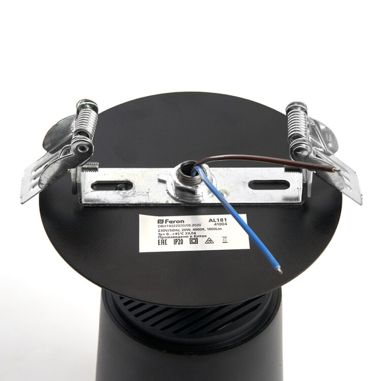 Светильник встраиваемый светодиодный, (ДВО) FERON AL181, 20W 4000К 230V, 1800Lm, IP20, цвет черный, корпус алюминий, рассеиватель поликарбонат, 108*108*200 мм, монтажн.отв. 95 мм.