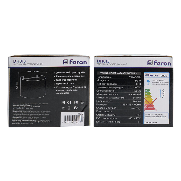 Светильник уличный светодиодный, на стену (ДБУ) FERON DH013, серия Майами, 6W, 4000К (белый натуральный), 230V/50Гц, 450Lm, IP54, 2LED*COB, класс защиты 1, раб.t -40°C...+40°C, цвет черный, корпус алюминий, 100*115*135мм,