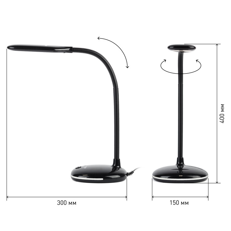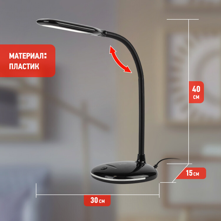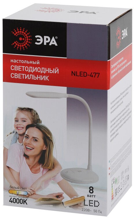 Настольный светильник ЭРА NLED-477-8W-BK со светод иодами (LED) в качестве источников света. У светильника выключатель на основании. Это базовая модель с оптимальным универсальным дизайном хорошей для работы за столом высоты (40 см). Гибкая стойка позволяет выбирать наиболее комфортное направление света.