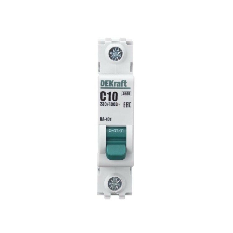 Автоматический выключатель серии ВА-101 Dekraft; 1P; номинальный ток 10 А; характеристика С; отключающая способность 4,5 кА. 5 монолитных заклепок повышают прочность корпуса аппарата. Сплошная лицевая панель обеспечивает безопасность эксплуатации аппарата. Боковые каналы охлаждения повышают стабильность работы при высоких температурах окружающей среды. Есть возможность установки дополнительных аксессуаров с левой стороны устройства. Аппарат на 100% совместим с корпусами Dekraft и Systeme Electric.