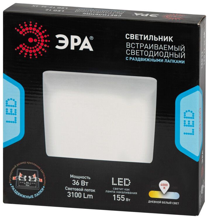 Встраиваемые точечные светильники LED 12-36-4K – прекрасное решение для самых разных помещений в Вашем доме или квартире. С помощью встраиваемых светильников можно подсвечивать от рабочего места до пространства для готовки на кухне. LED 12-36-4K выполнен из металла, отличающегося своими прочностью и надежностью. Внешний размер светильника - 220*220*21 миллиметров, а монтажный - регулируемый: 55-190 миллиметров. Степень защиты светильника - IP20, она дает возможность устанавливать его в разных помещениях, кроме тех, где повышена влажность. Тип рассеивателя - матовый, он способствует приятному и мягкому распространению света в комнате. Светильник обладает цветовой температурой в 4000К, что эквивалентно нейтральному дневному свету. Световой поток точечного светильника составляет 3 100 Лм. Для данной модели не нужна лампа, LED 12-36-4K работает при помощи встроенных светодиодов, срок службы которых составляет 30 000 часов. Мощность составляет 36 Вт. Светильник белого цвета, благодаря чему его можно размещать в самых разных по стилю интерьерах: минимализм, хай-тек, модерн, прованс или скандинавский. После установки Ваша комната преобразится и наполнится приятной атмосферой.