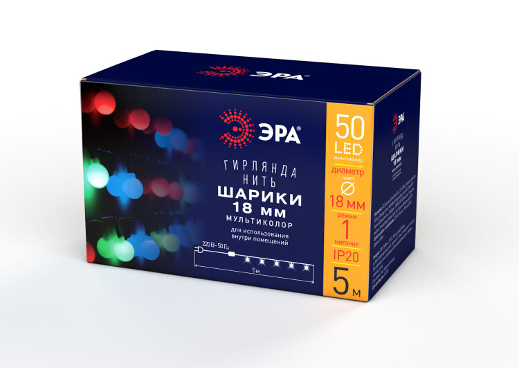 Новогодняя гирлянда мультиколор ЭРА "Шарики" с миниатюрными лампами-шарами диаметром 18 мм и режимом мигания. Отличное решение для декорирования пространства к праздникам - с помощью этой яркой разноцветной гирлянды можно украсить дом, елку, создать световую композицию. Вы оцените приятные нежные оттенки свечения. Благодаря использованию экономичной светодиодной технологии вы не потратите много средств на оплату электроэнергии. Дизайн с использованием универсальных ламп-шариков делает эту гирлянду отличным украшением помещения в любое время года, она поможет создать неповторимую атмосферу радости и уюта к каждому торжеству - от Дня рождения до свадьбы. Режим мигания поможет устроить танцевальную вечеринку и поднимет настроение гостям. На гирлянде-нити длиной 5 метров размещено 50 лампочек со светодиодами. Иллюминация будет яркой и объемной.