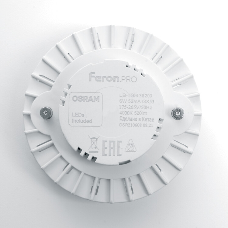 Лампа светодиодная FERON LB-1508, GX53 (таблетка), 8W 230V GX53 6400К (дневной), рассеиватель матовый белый, 690Lm, угол рассеивания 120°, 73*26мм