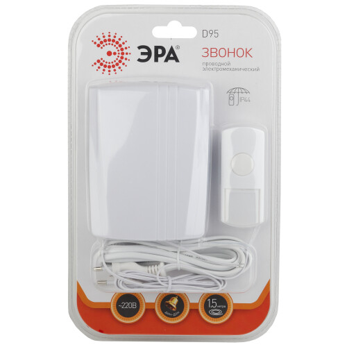 D95 ЭРА – дверной проводной электронный звонок с влагозащищённой кнопкой. Звонок ЭРА позволяет производить звуковое оповещение на расстоянии. Передача сигнала о нажатии кнопки происходит с помощью проводов. Степень защиты динамика - IP20, степень защиты кнопки - IP44. Имеет элегантный корпус, который отлично смотрится в любом интерьере. Устройство звенит классической мелодией дин-дон. Регулировки громкости нет. Универсальный белый цвет, аккуратный внешний вид. Удобный надёжный вариант с сетевым шнуром 1,5 метра.