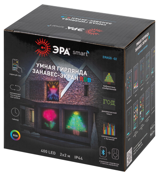 Инновационные гирлянды имеют десятки режимов работы и могут воспроизвести в цвете и в динамике любую картинку – как имеющуюся в базе, так и созданную пользователем. Смарт-иллюминация ЭРА управляется приложением или пультом ДУ, поставляемым в комплекте. Отличаются уникальным функционалом: синхронизация с музыкой, выбор любого из 256 оттенков свечения, создание уникальных сценариев подсветки, динамический текст и динамические цифры. Сотни микросветодиодов нового поколения в составе умных гирлянд ЭРА позволяют нарисовать и написать светом всё, что вам захочется. К примеру, вы можете организовать эффектный LED-отсчёт времени до наступления Нового года или написать светодиодами имя именинника на праздновании Дня рождения.