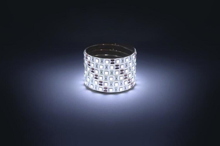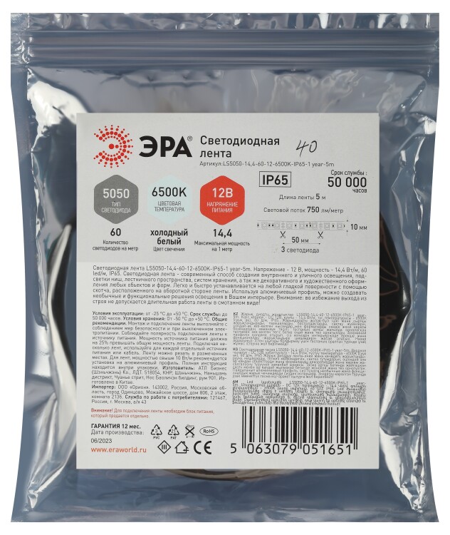 Светодиодная лента LS5050-14,4-60-12-6500K-IP65-1 year-5m со степенью защиты от пыли и влаги IP65 - современный способ создания внутреннего освещения, подсветки ниш, лестничного пространства, систем хранения, а также декоративного и художественного оформления любых объектов и форм в помещениях с повышенным уровнем влажности и уличного освещения. Легко и быстро устанавливается на любой гладкой поверхности с помощью скотча, расположенного на оборотной стороне ленты. Используя алюминиевый профиль, можно создавать необычные и функциональные решения освещения в Вашем интерьере. Рабочее напряжение ленты составляет 12 В, а мощность равна 14,4 Вт/м. Светодиодная лента обладает световым потоком 750 лм/м с холодным белым цветом свечения (6500К).