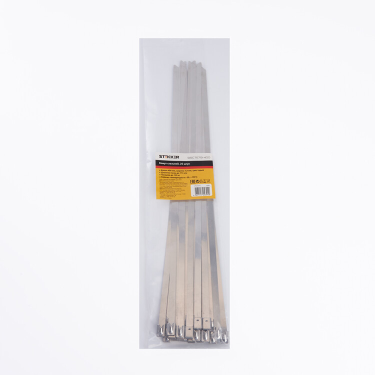 Хомут электромонтажный STEKKER SSCTE79-400, одноразовый, серый, материал - сталь, максимальный диаметр пучка - 114мм, нагрузка - 120кг, диапазон рабочих температур -80..+538°C, рекомендуемая температура хранениня -