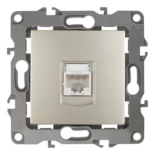 Розетка интернет RJ45 серии Эра 12 скрытой установки механизм цвет шампань 12-3107-04. Сделана из поликарбоната. Монтаж в подрозетник производится и на лапки, и на винты. Рамки приобретаются отдельно. Рамки Эра 12: 1 пост 12-5001-хх, 2 поста 12-5002-хх, 3 поста 12-5003-хх, 4 поста 12-5004-хх, 5 постов 12-5005-хх. Рамки Эра 12 Сатин: 1 пост 12-5101-хх, 2 поста 12-5102-хх, 3 поста 12-5103-хх, 4 поста 12-5104-хх, 5 постов - 12-5105-хх (хх - код цвета: 01-белый, 02-слоновая кость, 03-алюминий, 04-шампань, 05-антрацит, 06-чёрный, 07-ольха(белёный дуб-сатин), 08-вишня, 09-дуб, 10-венге, 11-сосна, 21-жёлтый, 22-оранжевый, 23-красный, 24-охра, 25-бордо, 26-лайм, 27-зелёный, 28-голубой, 29-синий).