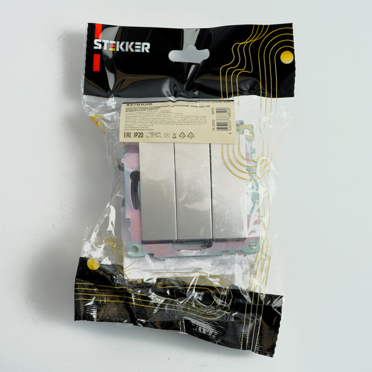 Выключатель трехклавишный STEKKER GLS10-7108-03, серия Катрин тип установки - скрытый, размер изделия 55*55*35мм., цвет серебро, материал изделия поликарбонат, латунь. Номинальное напряжение 250 , номинальный ток 10А, IP20