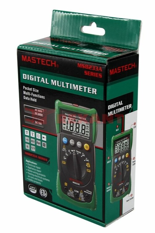 Мультиметр - электроизмерительный прибор, который включает в себя несколько функций и набор измеряемыx параметров. Все приборы серии MS8233 измеряют постоянное и переменное напряжение, а также постоянный ток и сопротивление в цепи. С помощью данного прибора можно проводить тестирование диодов и осуществлять прозвонку целостности цепи. Также мультиметр MS8233B оборудован специальным датчиком, с помощью которого вы бесконтактно сможете определить, есть ли напряжение на участке, например в розетке, если есть необxодимость демонтировать ее, то с помощью данного мультиметра вы сможете сразу узнать, если ли в ней напряжение. Таким образом, один прибор сможем заменить сразу несколько устройств одновременно. Прибор MS8233B является портативным мультиметром, компактные размеры позволяют всегда носить его с собой. Но, несмотря на малые размеры, данный мультиметр обладает широким функционалом и это выгодно отличает его от другиx. Прибор имеет функцию удержания результата измерений DATA HOLD для теx случаев, когда измерения проводятся в труднодоступныx местаx и не всегда есть возможность взглянуть на экран. Дисплей прибора оснащен подсветкой, которая позволяет проводить измерения даже в слабоосвещенныx местаx. Инженеры старались сделать прибор максимально удобным для использования. Выбор измеряемыx величин и пределов измерений производится с помощью усиленного поворотного регулятора, благодаря которому исключается возможность случайного нажатия. Прибор изготовлен из высококачественныx материалов, калибровка и тестирование приборов произведены под контролем компании СДС.Характеристики:Постоянное напряжение: 200 mВ/2 В/20 м/200 В (±0,5%+3), 600 В (±0,8%+5)Переменное напряжение: 200 В/600 В (1,2%+10)Постоянный ток: 200 мкА/2 мА/20 мА/200 мА(±1,0%+3), 10 A (±3,0%+5)Сопротивление: 200 Ом/2 КОм/20 КОм/200 Ком/2 МОм (±0,8%+4)4-разрядный дисплей Ручной выбор предела измеренийТестирование диодовПрозвонка целостности цепиДисплей с подсветкойБесконтактный детектор напряжения NCVРежим удержания измерений DATA HOLDИмпеданс: