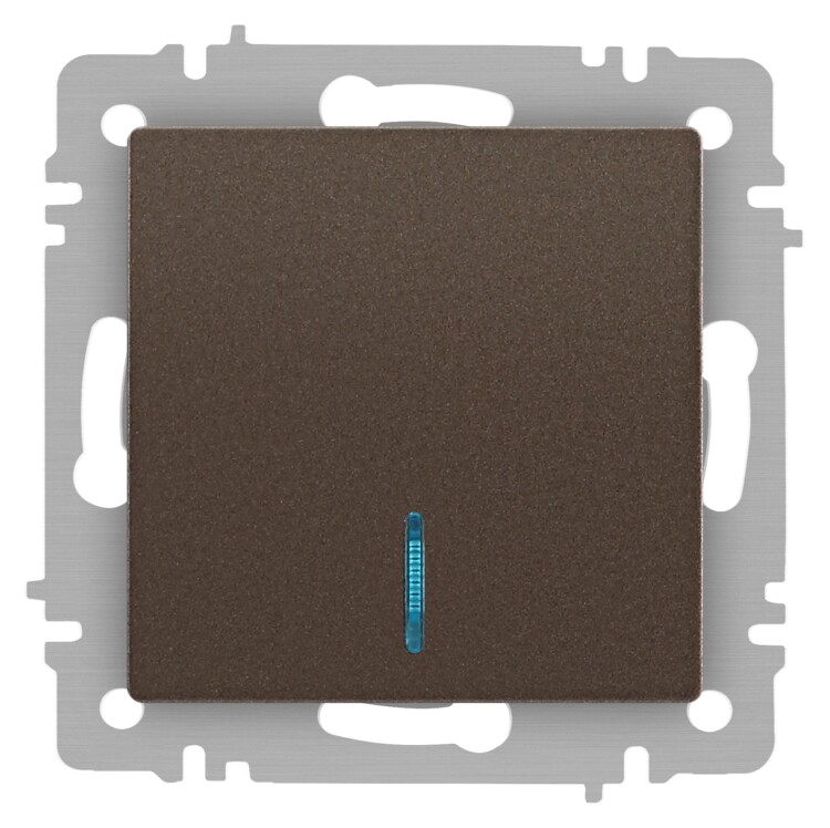 Выключатель 1-клавишный с подсветкой серии Intro Accent скрытой установки механизм цвет бронза 6-102-08. Номинальные характеристики 10А 250В. Выполнен из негорючего термопласта, оснащён винтовыми клеммами. Парные клеммы обеспечивают соединение шлейфом. Монтаж в подрозетник производится и на лапки, и на винты. Рамка приобретается отдельно. В серии представлены рамки до 5 постов: на 1 пост - 6-501-хх, на 2 поста - 6-502-хх, на 3 поста - 6-503-хх, на 6 поста - 4-504-хх, на 5 постов - 6-505-хх (где хх - цветовой код: 01 - белый, 01М - матовый белый, 02 - слоновая кость, 03 - алюминий, 04 - шампань, 05 - антрацит, 06 - перламутр, 07 - графит, 08 - бронза, 09 - титан, 10 - венге, 11 - сосна)