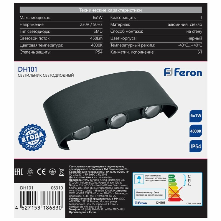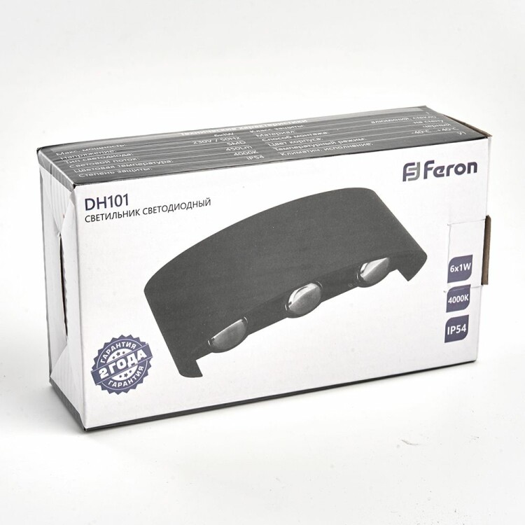 Светильник уличный светодиодный, на стену (ДБУ) FERON DH101, серия Нью-Йорк, 6W, 4000К (белый натуральный), 230V/50Гц, 450Lm, IP54, 6LED*SMD, класс защиты 1, раб.t -40°C...+40°C, цвет черный, корпус алюминий, 170*40*80мм,