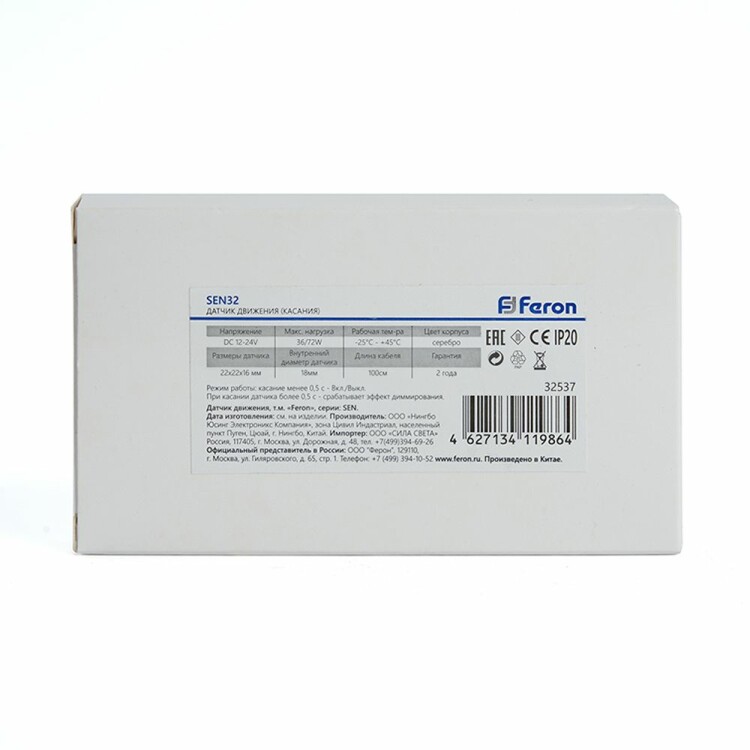 Датчик движения FERON SEN32 на касание, встраиваемый, IP20, 12/24V, 36/72W, расстояние обнаружения касание, цвет серебро, 22*22*16мм