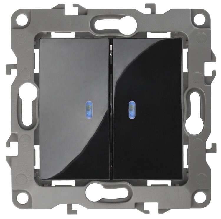 Выключатель 2-клавишный проходной серии Эра 12 скрытой установки механизм цвет чёрный 12-1106-06. Номинальные характеристики 10А 250В . Сделан из поликарбоната, оснащёно автоматическими клеммами для быстрй и надёжной фиксации жил кабеля в механиме. Парные клеммы обеспечивают соединение шлейфом. Монтаж в подрозетник производится и на лапки, и на винты. Рамки приобретаются отдельно. Рамки Эра 12: 1 пост 12-5001-хх, 2 поста 12-5002-хх, 3 поста 12-5003-хх, 4 поста 12-5004-хх, 5 постов 12-5005-хх. Рамки Эра 12 Сатин: 1 пост 12-5101-хх, 2 поста 12-5102-хх, 3 поста 12-5103-хх, 4 поста 12-5104-хх, 5 постов - 12-5105-хх (хх - код цвета: 01-белый, 02-слоновая кость, 03-алюминий, 04-шампань, 05-антрацит, 06-чёрный, 07-ольха(белёный дуб-сатин), 08-вишня, 09-дуб, 10-венге, 11-сосна, 21-жёлтый, 22-оранжевый, 23-красный, 24-охра, 25-бордо, 26-лайм, 27-зелёный, 28-голубой, 29-синий).