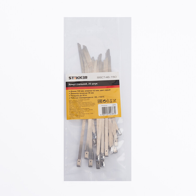 Хомут электромонтажный STEKKER SSCT46-150, одноразовый, серый, материал - сталь, максимальный диаметр пучка - 38мм, нагрузка - 50кг, диапазон рабочих температур -50..+150°C, рекомендуемая температура хранениня -