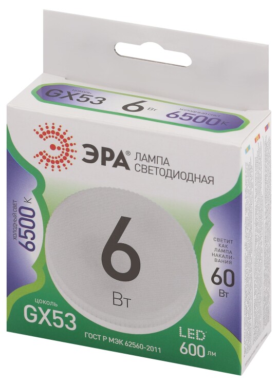 Светодиодная лампа ЭРА LED GX-6W-865-GX53 GL серии Green Line — современный и экономичный аналог лампы накаливания. Лампочка с цоколем GX53 и мощностью 6 Вт излучает холодный белый свет (6500K), создавая комфортное освещение. Плоская форма плафона и универсальный размер 75 мм позволяют использовать её в потолочных светильниках, настенных бра и мебельной подсветке. Такая светодиодная лампа подойдет для дома, офисов, магазинов и гостиниц. Потребляет минимум энергии, не нагревается и служит значительно дольше традиционных ламп накаливания. Работает от сети 220 В, эквивалентна 60 Вт лампе накаливания.
