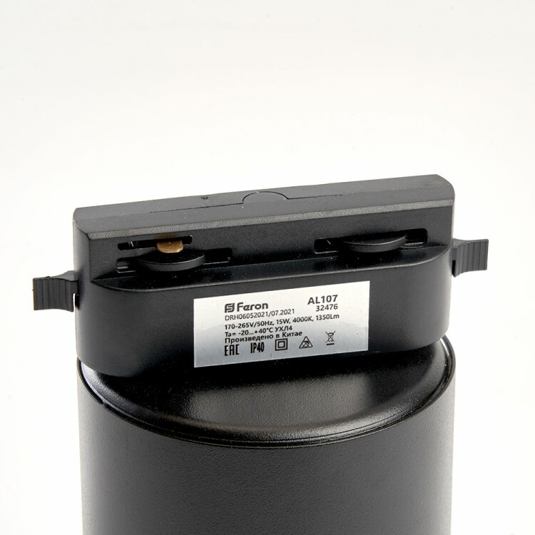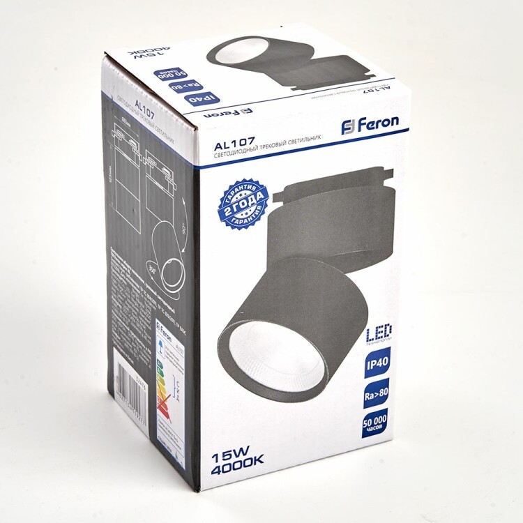 Светильник трековый на шинопровод, однофазный (ДПО) FERON AL107, 15W, 4000К (белый), 170-265V, 1350Lm, цвет черный, корпус алюминий, рассеиватель стекло, вращение →350°/↓90°, 83*83*125 мм