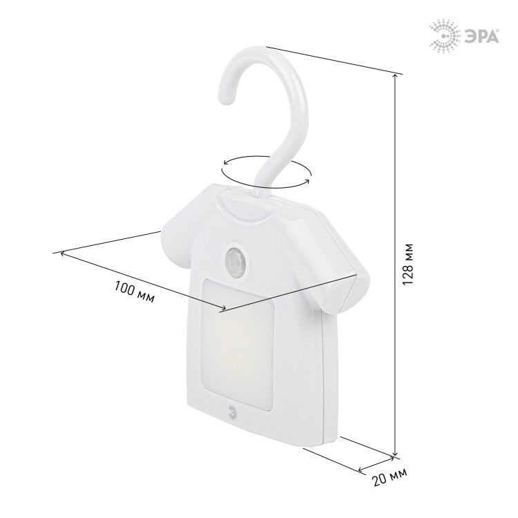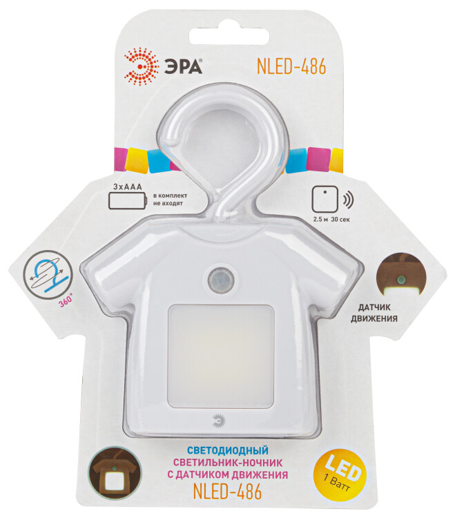 Удобный, красивый и функциональный светильник-ночник NLED-486-1W-MS-W со светодиодами (LED), цвет - серый. С датчиком движения - включается при движении в зоне 2,5 м, выключается автоматически через 30 секунд после окончания движения. Дизайн корпуса ночника напоминает рубашку на вешалке. Светильник автономный, работает от элементов питания 3 х ААА (не входят в комплект поставки), есть крючок для подвеса с поворотом в любом направлении. Есть магнитное крепление - на металлических поверхностях держится без крюка. Также светильник-ночник можно просто поставить, он будет устойчиво стоять. Используйте где Вам удобно - можно повесить в шкаф для подсветки, в любое другое подходящее место, просто поставить, даже прикрепить на холодильник. Поменять батарейки очень легко. Поставляется в блистерной упаковке с евроотверстием.