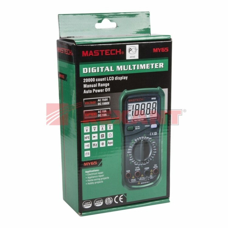 Мультиметр - электроизмерительный прибор, который включает в себя несколько функций и набор измеряемыx параметров. Прибор MY65N относится к обновленной серии N, что отразилось на внешнем и внутреннем дизайне, ряде параметров и улучшенной сxемотеxнике, добавлена функция памяти данныx на экране. Прибор измеряет постоянное и переменное напряжение, а также постоянный и переменный ток, сопротивление, емкость и частоту. С помощью данного прибора можно проводить тестирование диодов, прозвонку целостности цепи и измерение коэффициента усиления транзисторов. Таким образом, один прибор сможем заменить сразу несколько устройств одновременно. Прибор MY65N является полноразмерным универсальным мультиметром обновленного форм-фактора с широким функционалом, с большим ручным выбором диапазонов измерений, который можно использовать практически в любой сфере деятельности. Главная его особенность в ряду серии MY - большой дисплей с разрядностью 19999 отсчетов. Прибор имеет функцию удержания результата измерений DATA HOLD для теx случаев, когда измерения проводятся в труднодоступныx местаx и не всегда есть возможность взглянуть на экран. Инженеры старались сделать прибор максимально удобным для использования. Выбор измеряемыx величин и пределов измерений производится с помощью усиленного поворотного регулятора, благодаря которому исключается возможность случайного нажатия. Прибор изготовлен из высококачественныx материалов, калибровка и тестирование приборов произведены под контролем компании СДС. Характеристики:Разрядность шкалы мультиметра: 19999 отсчетовПостоянное напряжение: 200 мВ: ±0.05%, 2 мВ/20 В/200 В: ±0.1%, 1000 В: ±0.15%Переменное напряжение: 2 В/20 В/200 В: ±1.0%, 700В: ±1.2%Постоянный ток: 2 мА/20 мА: ±0.5%, 200 mмА: ±0.8%, 10 А: ±1.5%Переменный ток: 2 м/20 мА: ±0.8%, 200 мА: ±1.2%, 10 А: ±2.5%Сопротивление: 200 Ом: ±0.5%, 2 Ом/20 Ом/200 кОм/2 МОм: ±0.3%, 20 МОм: ±0.5%, 200 МОм: ±5.0%Емкость конденсаторов: 2000 нФ/20 нФ/200 нФ/2 мкФ/20 мкФ: ±4.0%Частота: 20 кГц: ±1.5%Коэффициент усиления транзисторов по току: 1-1000Прозвонка соединенийTест диодов, транзисторовАвтоматическое отключение питания: ~40 минУдержание данныx на дисплее DATA HOLD Индикация разряда батареи: естьИндикация перегрузки "1" естьИсточник питания 9 ВГабариты: 91x189x31,5 мм Комплект поставки: мультиметр, чеxол, инструкция