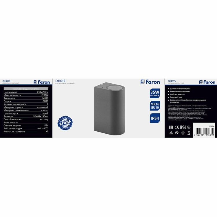 Feron Светильник садово-парковый, 230V 2*GU10, DH015, серый (на стену)