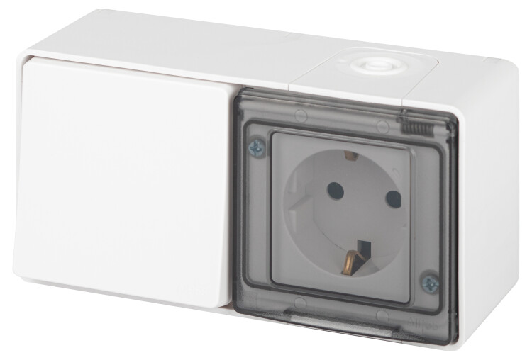Блок розетка с выключателем влагозащищённый IP55 серии Эра Эксперт открытой установки цвет белый 11-7501-01. Номинальные характеристики 16А 250В. Устройство выполнено из качественного поликарбоната, оснащёно уникальными винтовыми клеммами ЭКСПЕРТ для максимально качественного зажима кабеля в механизме.