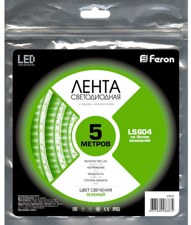 Лента светодиодная 12V FERON LS604, 60*SMD2835, 4,8W/m, IP65, (зеленый), Кратность резки мм 50мм, 5000 *8 *3,8мм