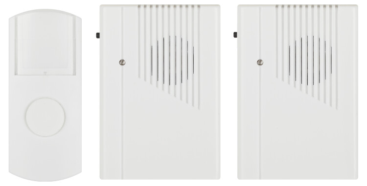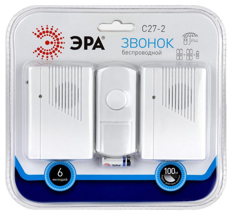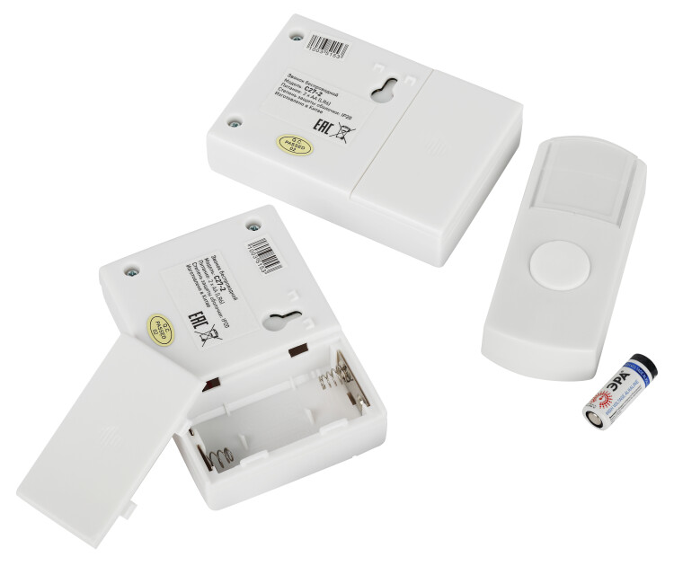 Беспроводной электрический дверной звонок с 2 динамиками в комплекте. Динамики можно с удобством разместить в разных комнатах или разных помещениях (актуально для дач и загородных домов с многочисленными постройками на территории). Радиус действия до 100 метров. Кнопка защищена от влаги и пыли (IP44). В числе преимуществ 6 встроенных мелодий и световой сигнал. Звонок работает от батареек: для кнопки - 1 шт А23 (входит в комплект), для каждого из динамиков - по 2 шт АА пальчиковые (в комплект не входят).