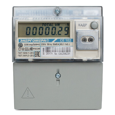 Энергомера Счетчик электроэнергии CE102 R5.1 145-JAN 230В; 5-60А (1,0; оптопорт; RS-485; мнТ; DIN/3 винта) (2021 г.)