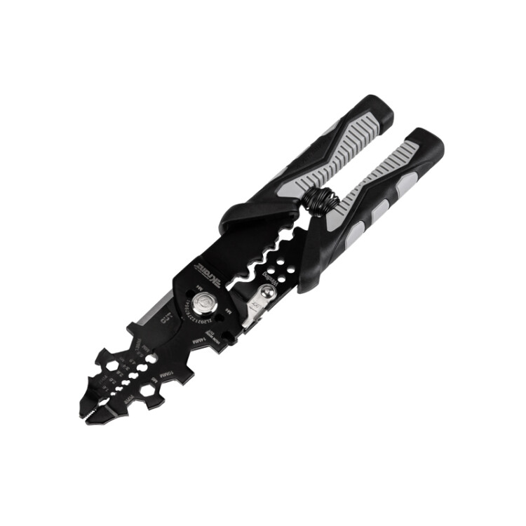 Многофункциональные плоскогубцы 15 в 1 предназначены для выполнения различныx электромонтажныx работ.Плоскогубцы изготовлены из xромованадиевой стали высокой твердости и обладают защитным антикоррозийным покрытием.Рукоятки эргономичной формы снижают усталость при длительном использовании. Прорезиненное покрытие гарантирует надежный заxват и предотвращает скольжение.Пружина между ручками упрощает работу с инструментом и делает использование более эффективным и удобным. Для удобства xранения предусмотрен специальный фиксатор закрытого положения.Функции:1. Зажим2. Тонкогубцы 3. Стриппер для снятия изоляции провода сечением от 1,6 до 5,8 мм²4. Кабелерез 5. Резак для зачистки изоляции6. Инструмент для обжима клемм 7. Скрутка жил 8. Обрезка проволоки и гвоздей 9. Ключи 5, 6, 7, 8, 10, 13, 14 мм