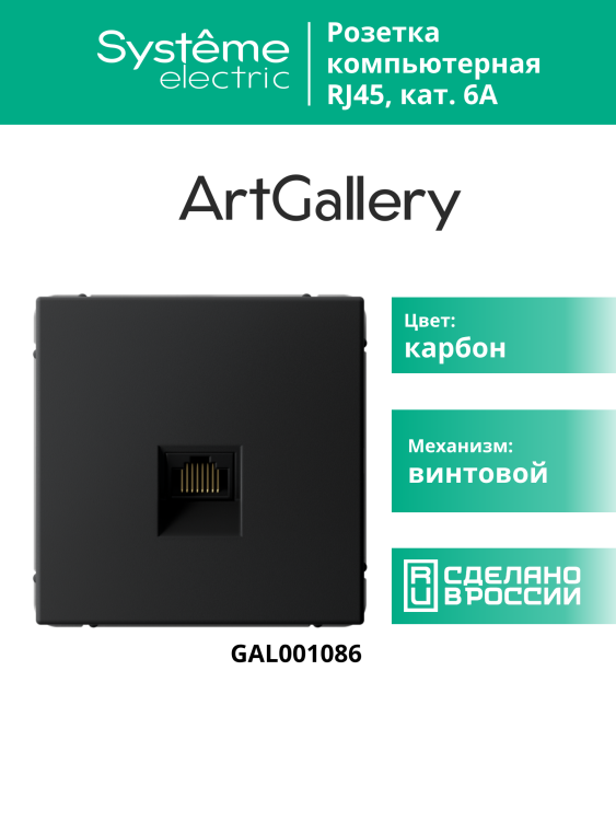 Механизм Systeme Electric серии ArtGallery в цвете карбон розетки компьютерной с разъёмом RJ45 категории 6А предназначен для удобного и быстрого подключения вашего компьютера к локальной вычислительной сети.