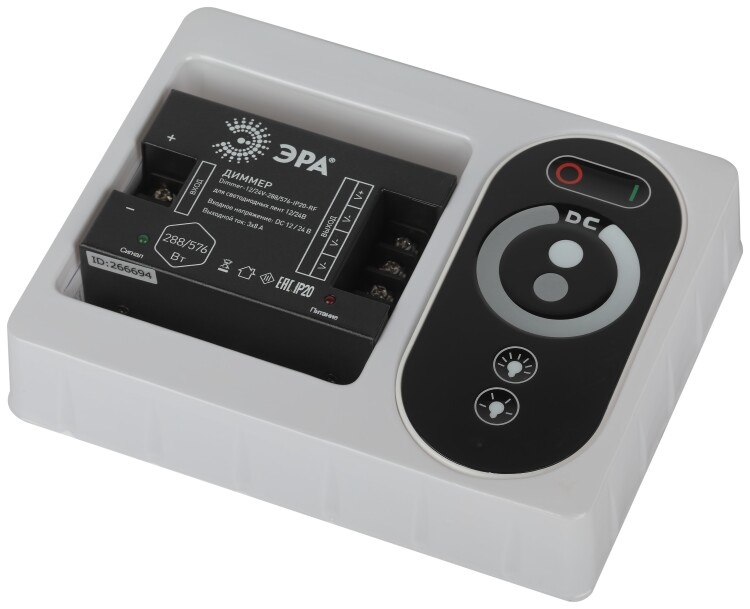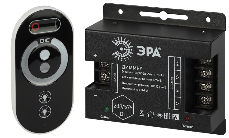 Диммер для светодиодной ленты с артикулом Dimmer-12/24V-288/576-IP20-RF работает напряжением 12В и 24В. При напряжении 12В максимально допустимая мощность нагрузки составляет 288Вт, а при напряжении питания 24В этот показатель равен 576Вт. Данное устройство используется регулирования яркости свечения светодиодной ленты. Диммер комплектуется сенсорным радио пультом для дистанционного управления, который имеет привязку к комплектному контроллеру и не будет взаимодействовать с другими устройствами. Пульт работает с контроллером на дистанции до 30м.